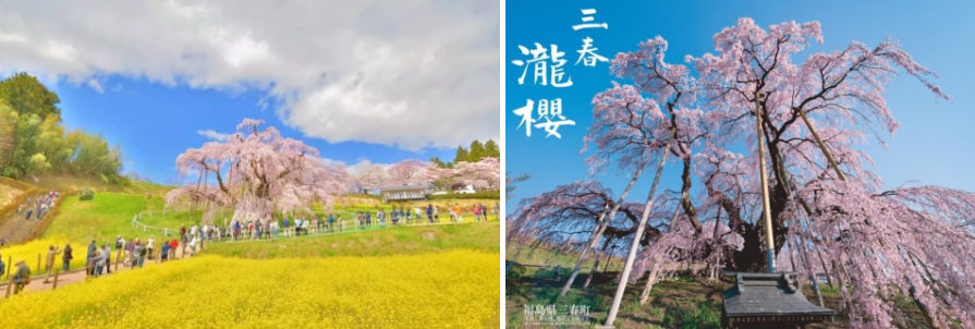 후쿠시마현 미하루 마을에 위치한 '미하루 타키자쿠라'는 수령 1,000년이 넘는 거대한 벚꽃나무로, '폭포 벚꽃'이라는 뜻을 지니고 있습니다. 2025년 예상 만개일은 4월 22일로, 비교적 한적한 장소에서 벚꽃을 감상하고자 하는 분들께 추천드립니다.